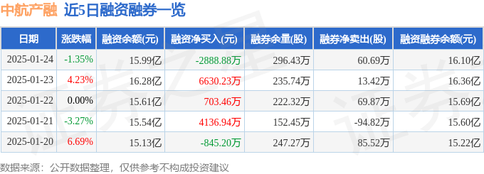 中航产融融资融券信息显示,融资方面,当日融资买入1.04亿元,融资偿还1.33亿元,融资净偿还2888.88万元。融券方面,融券卖出92.27万股,融券偿还31.58万股,融券余量296.43万股,融券余额1081.97万元。融资融券余额16.1亿元。