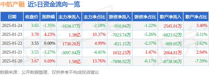 本站消息,截至2025年1月24日收盘,中航产融(600705)报收于3.65元,下跌1.35%,换手率2.33%,成交量205.29万手,成交额7.49亿元。